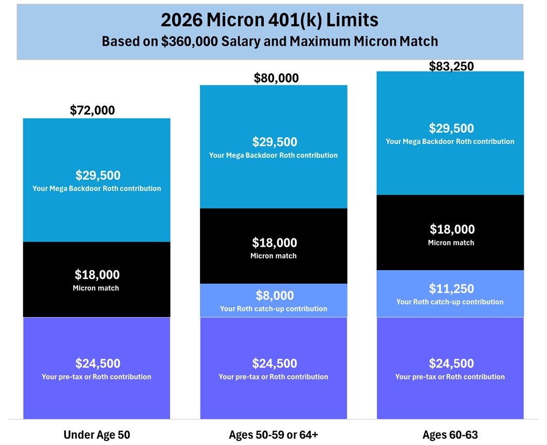 In addition to your pre-tax and Roth contributions and the Micron match, you can utilize a Mega Backdoor Roth. You can contribute after-tax to your 401(k) up to the limit of all employee and employer contributions, then convert those after-tax contributions to a Roth IRA or Roth 401(k).